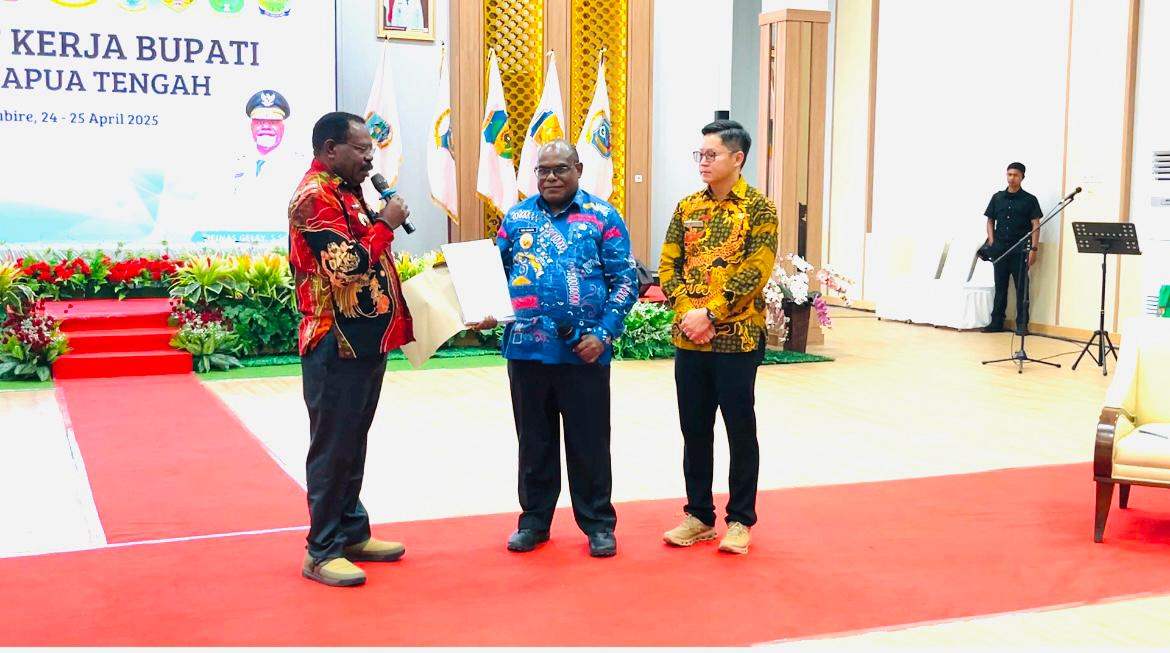Nabire, Admediapapua.com – Dalam Rapat Kerja Bupati se-Papua Tengah yang diadakan di Provinsi Papua Tengah, Bupati Nabire, Mesak Magai, S.Sos., M.Si, menyampaikan presentasi yang menggugah semangat dan penuh visi untuk pembangunan daerah. Dalam presentasinya, Bupati Mesak mengucapkan syukur kepada Tuhan Yang Maha Kuasa atas kesempatan untuk berkumpul dan berdiskusi demi kemajuan Provinsi Papua Tengah.