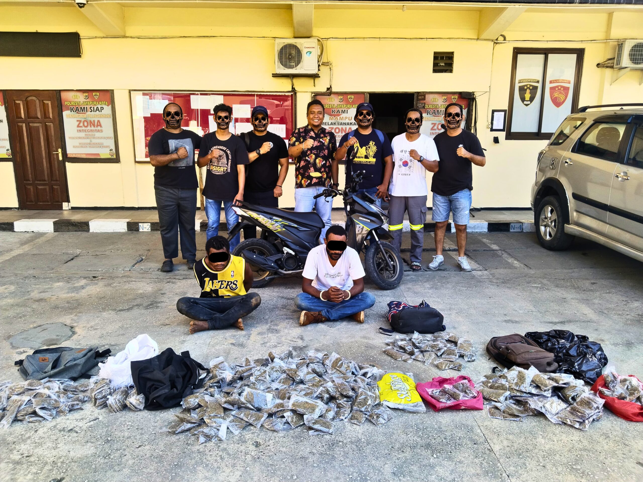 Saat diberhentikan, tim opsnal langsung melakukan pemeriksaan terhadap barang bawaan keduanya. “Hasil pemeriksaan barang bawaan kedua pelaku tim menemukan barang bukti ganja sebanyak 50 plastik bening ukuran besar, 326 plastik bening ukuran sedang, 1 karung beras ukuran 5 kilogram yang mana semuanya berisikan narkotika golongan I jenis ganja, dengan total berat keseluruhan sekitar 7,4 kilogram,” kata AKP Febry.