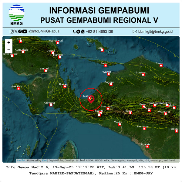 Nabire, admediapapua.com – Kepala Badan Nasional Penanggulangan Bencana (BNPB), Letjen TNI Suharyanto, menggelar konferensi pers yang disiarkan secara langsung melalui KompasTV terkait gempa yang mengguncang Kabupaten Nabire, Papua Tengah, pada 19 September 2025. Gempa dengan kekuatan magnitudo 6,6 terjadi pukul 03.19 WIT dengan pusat gempa berada 29 km barat laut Nabire, pada kedalaman 24 km.