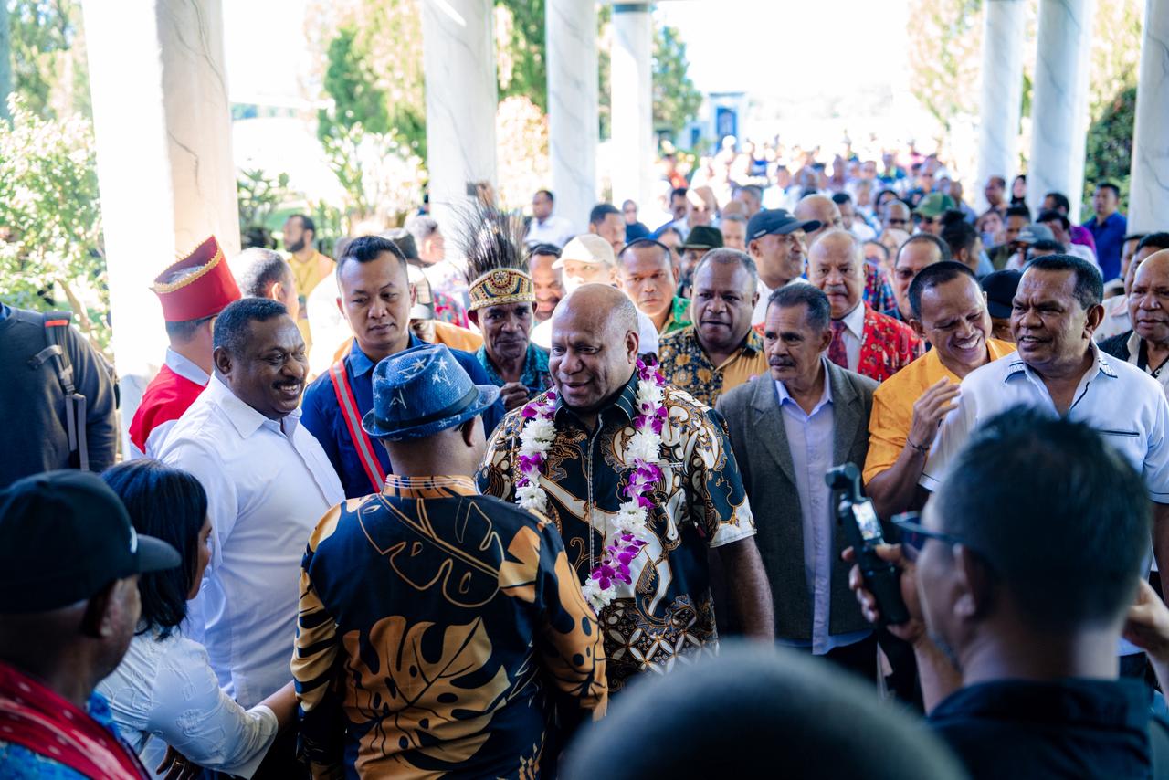 Tiba di Bandar Udara VIP Sentani, Gubernur dan Wakil Gubernur Provinsi Papua, disambut dengan penyematan mahkota dan kalung yang dihiasi pernak-pernik tradisional khas Papua oleh masyarakat.