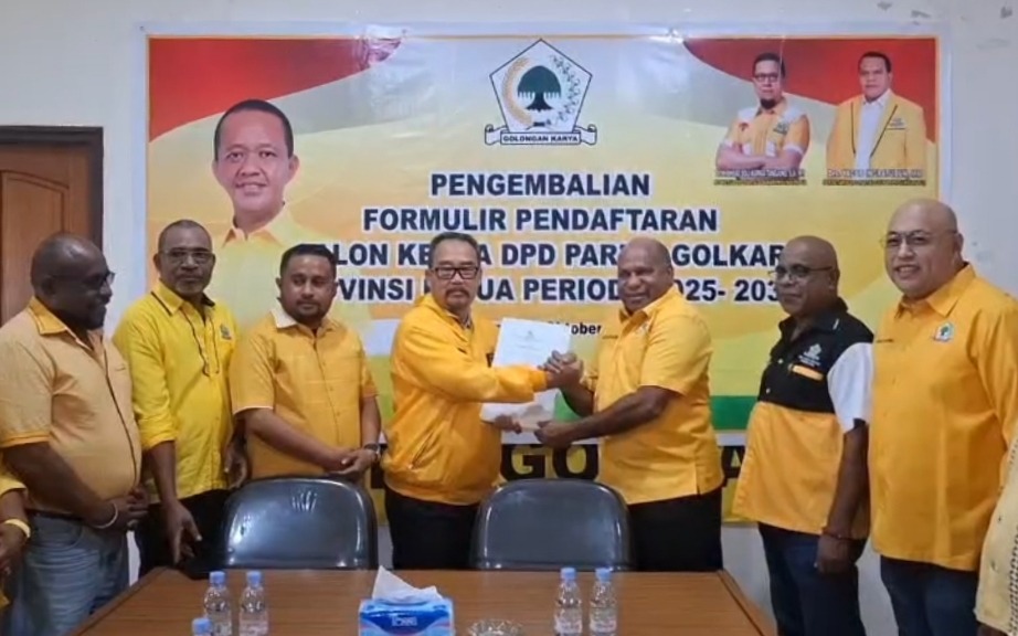 Jayapura, admediapapua.com – Mathius D. Fakhri secara resmi mengembalikan berkas pencalonannya untuk posisi Ketua Dewan Pimpinan Daerah (DPD) Partai Golkar Papua. Penyerahan berkas ini dilakukan di Kantor DPD I Golkar Papua dan diterima langsung oleh Ketua Steering Committee Musda XI, Tan Wie Long, yang disaksikan oleh panitia Musda.