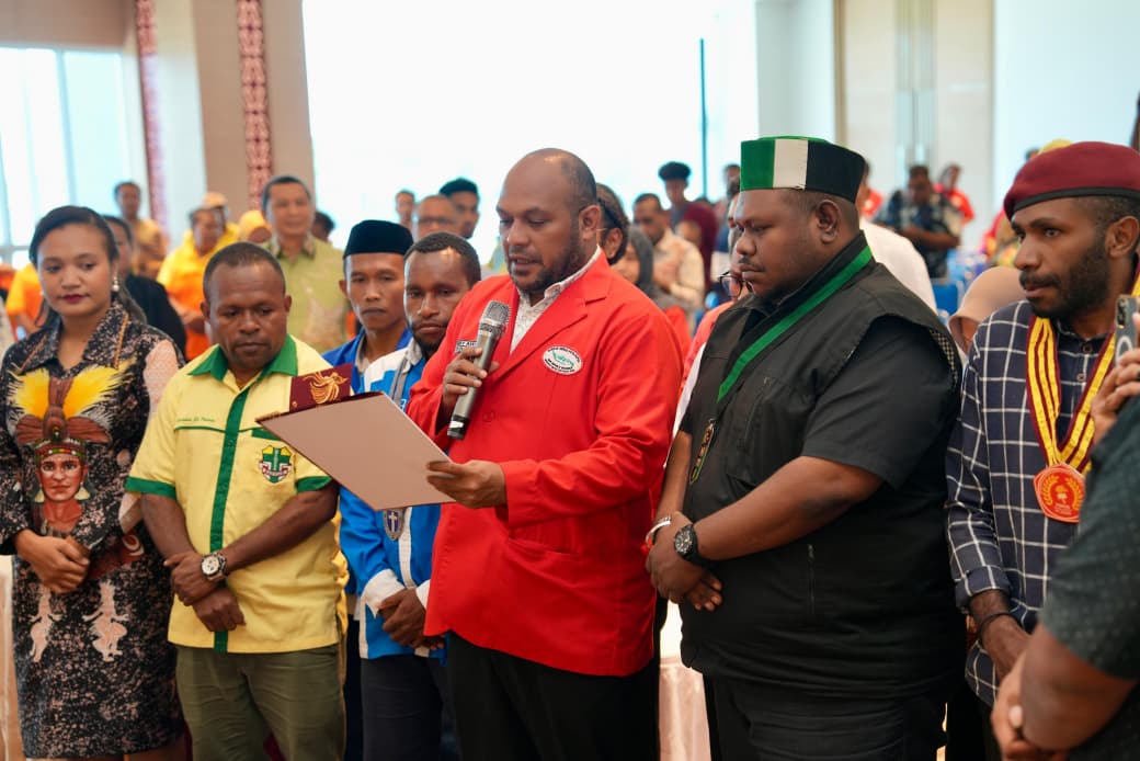 Selanjutnya, acara dilanjutkan dengan pembacaan deklarasi oleh Ketua Barisan Merah Putih Kota Jayapura, Bobby J.E. Awi, S.STP., M.Si., yang menyampaikan pernyataan sikap pemuda Papua pada momentum Hari Sumpah Pemuda. “Pada momentum Hari Sumpah Pemuda, kami pemuda-pemudi Papua bertekad dan berjanji untuk memberikan waktu, upaya, pikiran, dan hati kami untuk bangsa, negara, dan daerah kami. Satu, kami pemuda dan pemudi Papua berjanji akan bersama-sama seluruh agama masyarakat. Kedua, kami pemuda dan pemudi Papua mendukung penuh kepemimpinan dan program Bapak Prabowo Subianto sebagai Presiden Republik Indonesia. Ketiga, kami pemuda dan pemudi Papua mendukung dan siap menjadi pelaku pembangunan Papua di bawah Kepemimpinan Gubernur Papua Bapak Komjen Paul Purnawirawan Matius Fahiri S.I.K.M.H. dan Wakil Gubernur Papua Bapak Aryoko Rumaropen S.P.M.N. Pernyataan sikap ini kami buat dan penuh rasa tanggung jawab sebagai generasi penerus dan pelurus bangsa Indonesia.” [red]