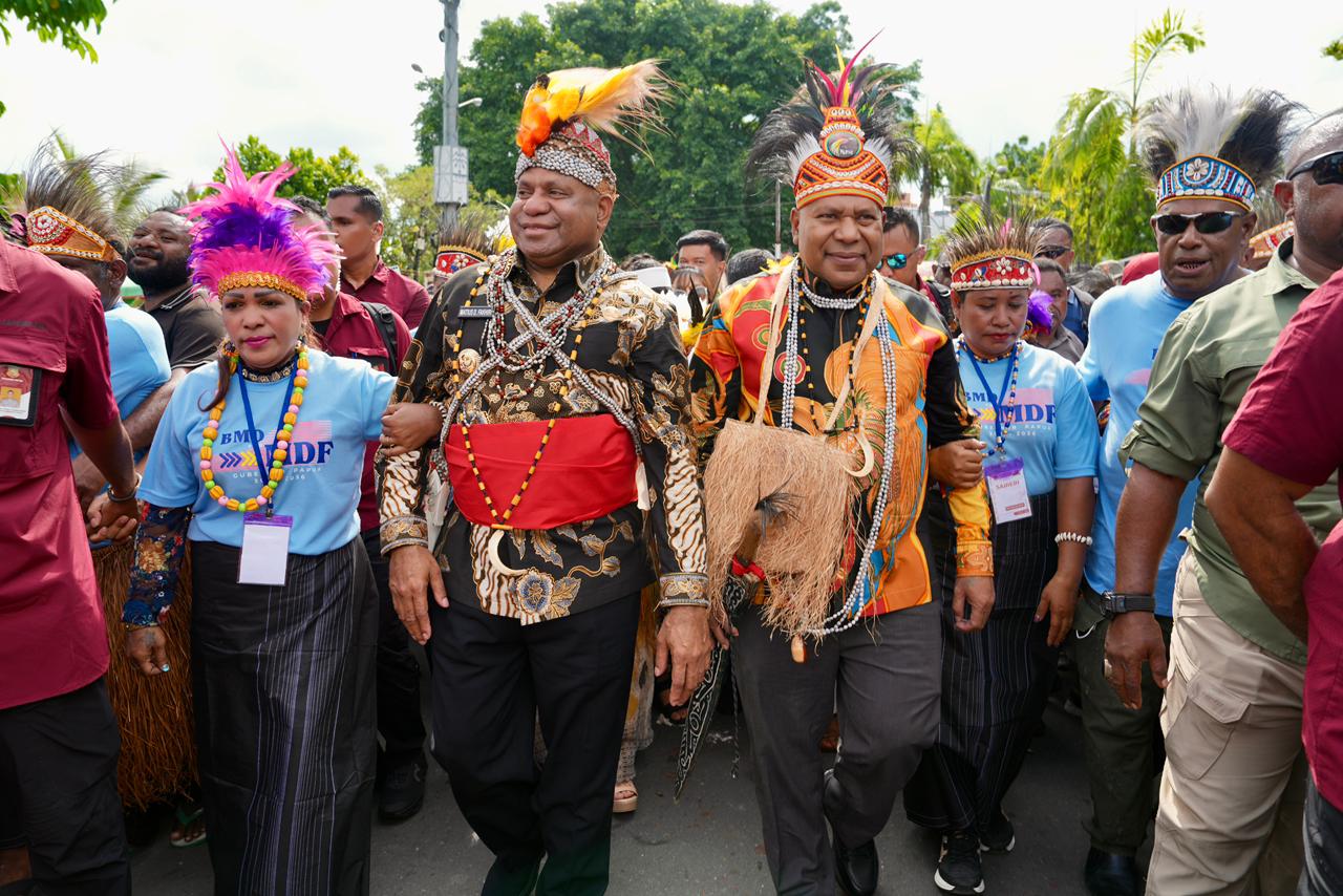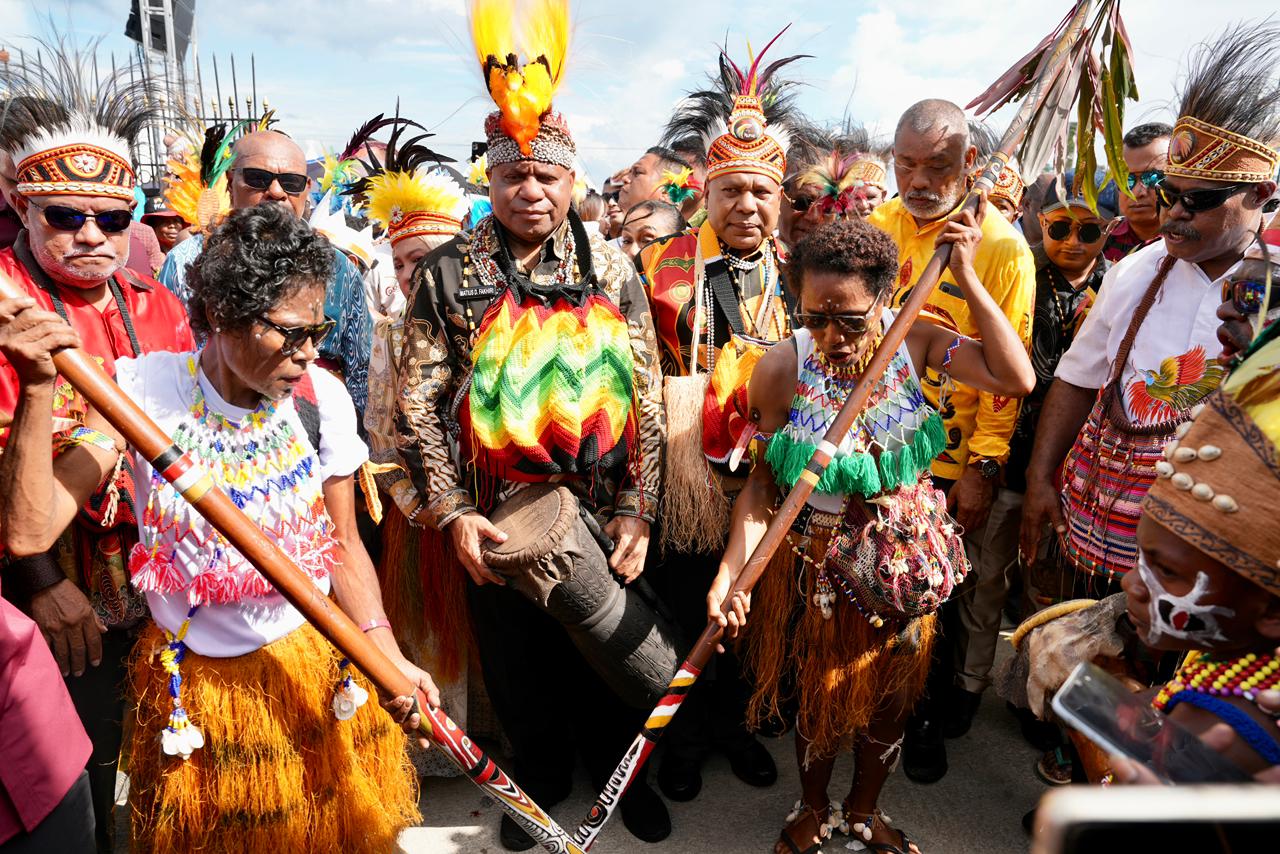 Dari titik awal, rombongan pemimpin daerah diiringi tabuhan tifa dan tarian adat menuju etape berikutnya. Adat La Pago dan Mee Pago—mewakili wilayah pegunungan—menyematkan ikatan kepala serta noken kehormatan sebagai penanda dukungan rakyat dan pengharapan agar kepemimpinan berjalan bijaksana serta berpihak pada masyarakat.