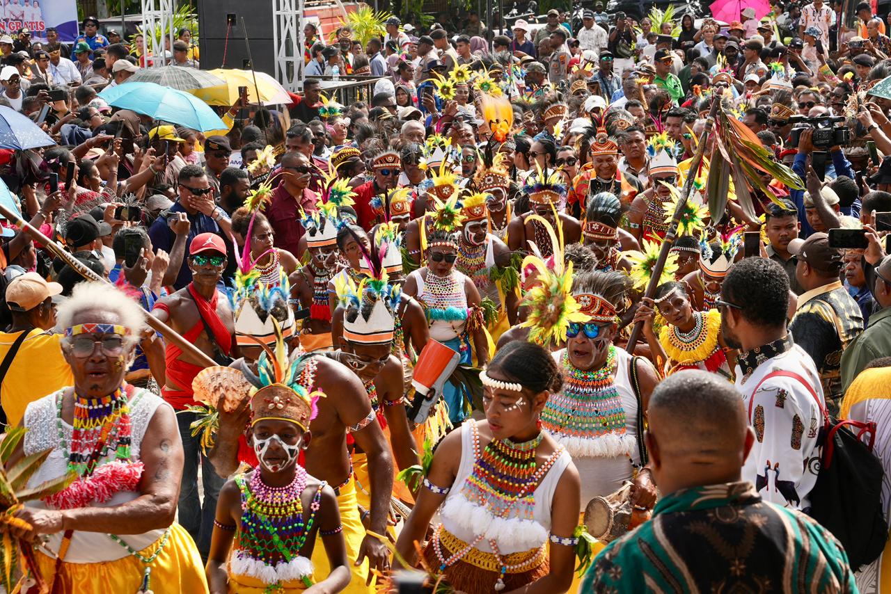 Sejak pagi, ribuan warga memadati lokasi. Banyak yang mengenakan busana tradisional dan membawa bendera daerah. Tabuhan tifa, nyanyian adat, serta sorak-sorai menggema ketika rombongan pemimpin tiba.