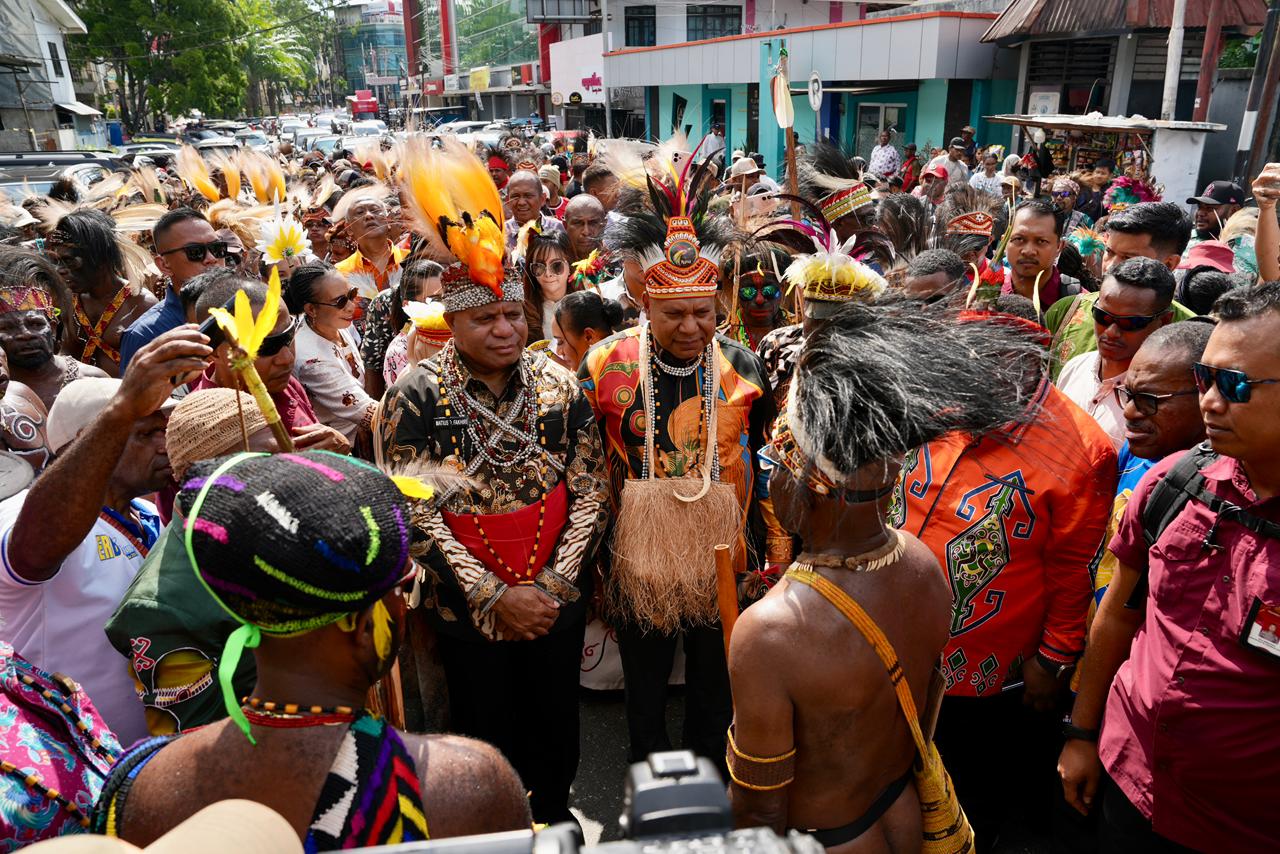Dari titik awal, rombongan pemimpin daerah diiringi tabuhan tifa dan tarian adat menuju etape berikutnya. Adat La Pago dan Mee Pago—mewakili wilayah pegunungan—menyematkan ikatan kepala serta noken kehormatan sebagai penanda dukungan rakyat dan pengharapan agar kepemimpinan berjalan bijaksana serta berpihak pada masyarakat.