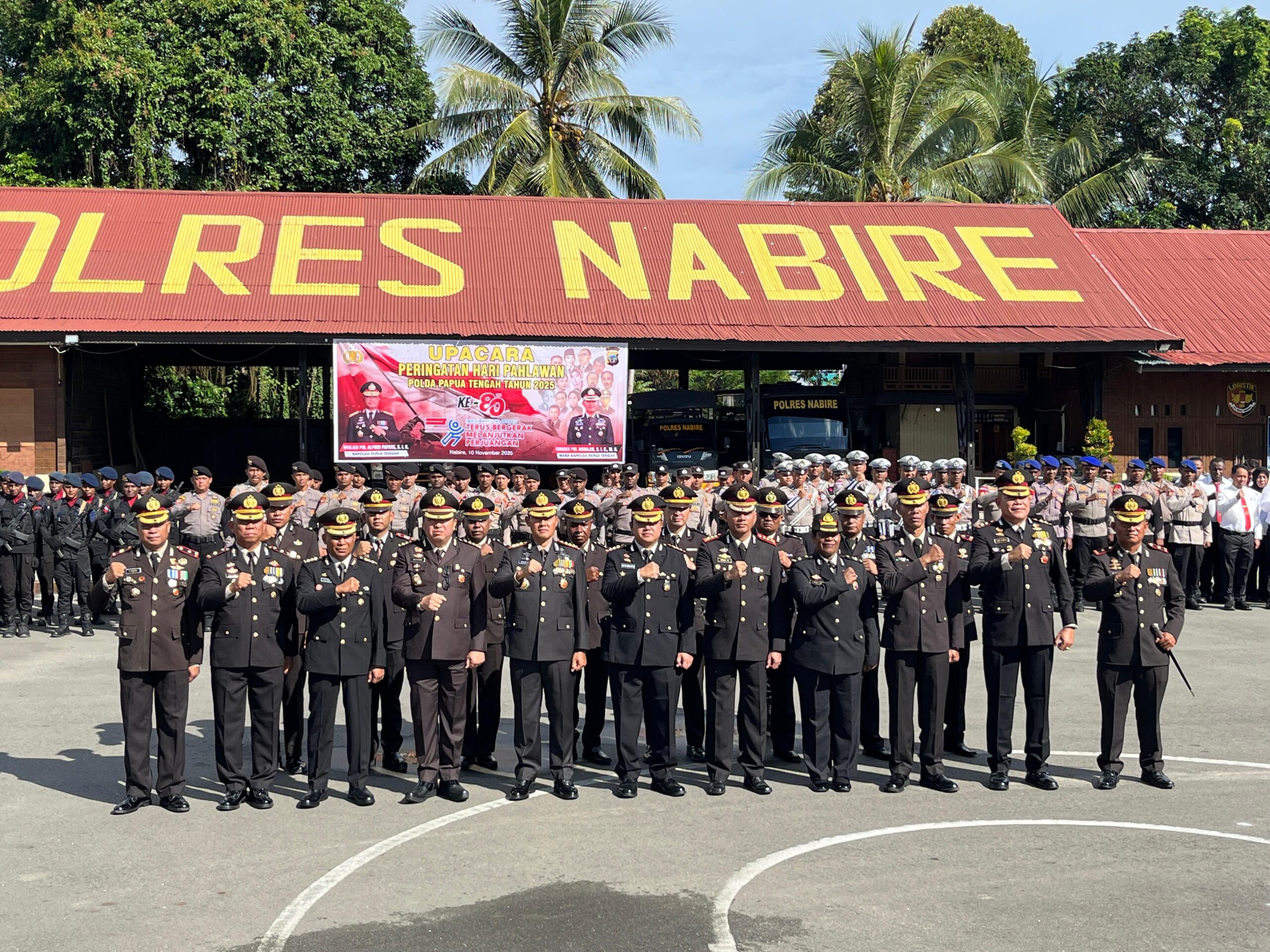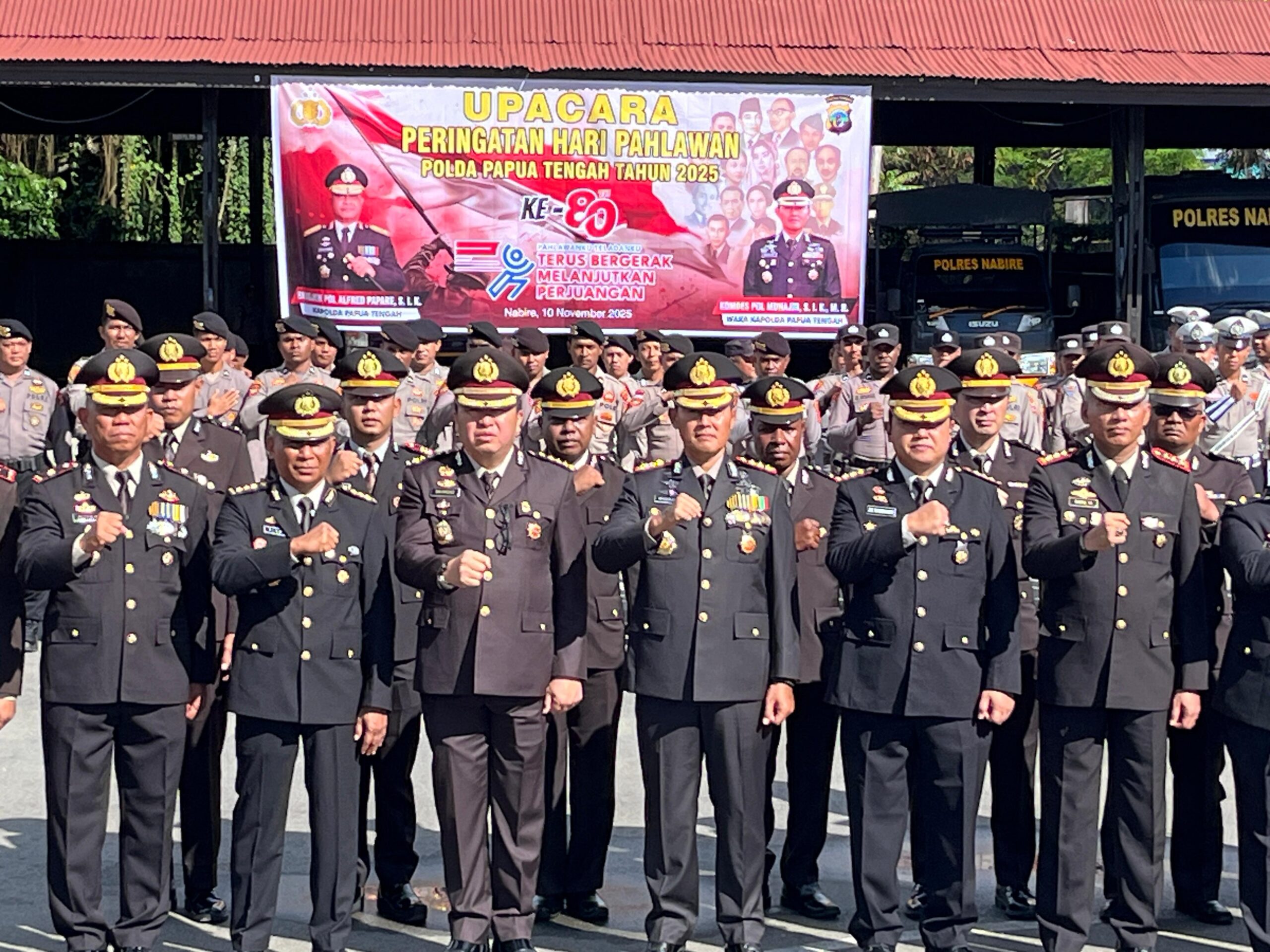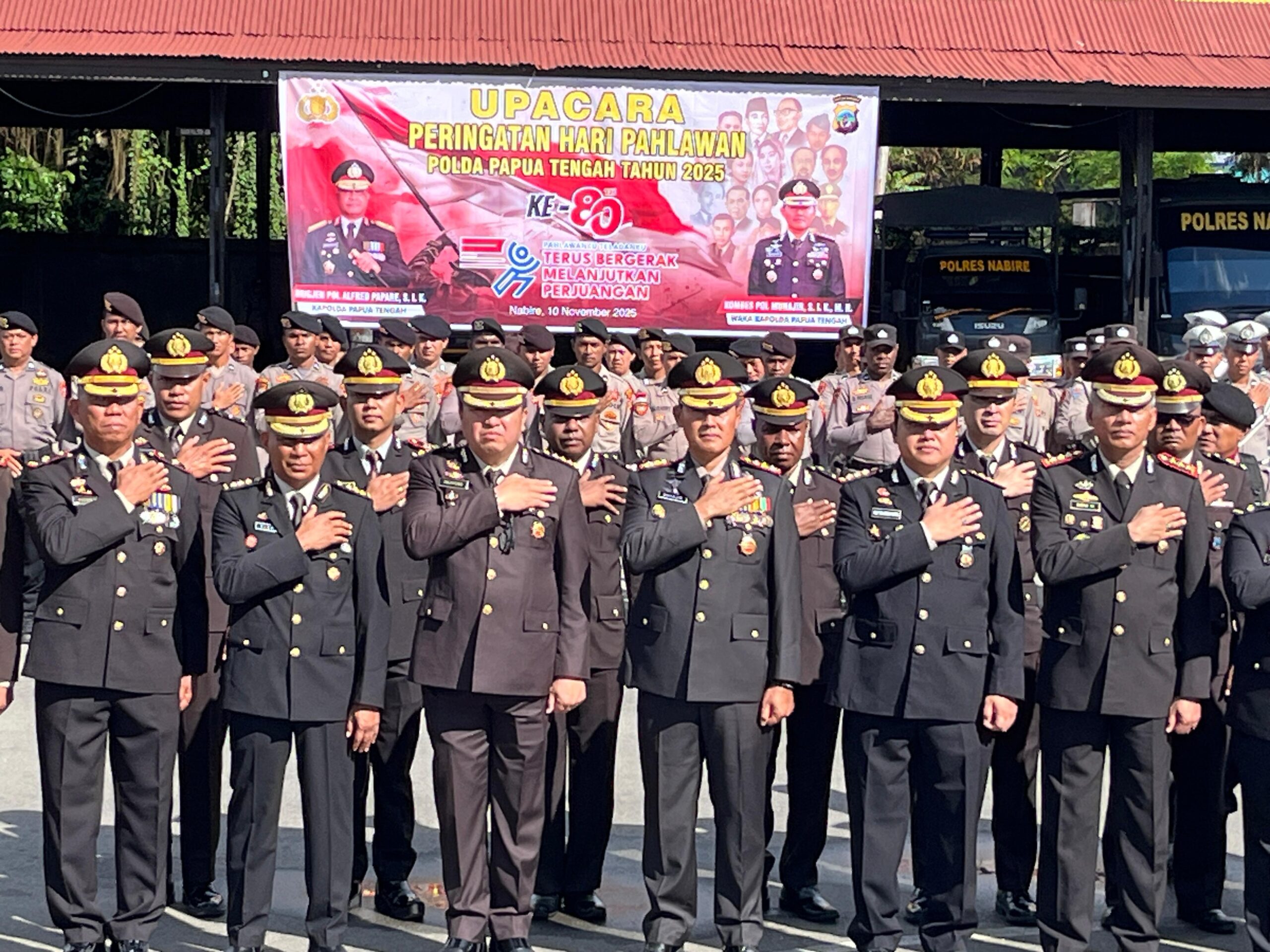 Nabire, admediapapua.com – Kepolisian Daerah (Polda) Papua Tengah menggelar Upacara Peringatan Hari Pahlawan 2025 di Nabire, Senin, 10 November 2025, dengan mengusung tema “Pahlawan Teladanku: Terus Bergerak Melanjutkan Perjuangan.” Wakil Kepala Kepolisian Daerah (Wakapolda) Papua Tengah, Kombes Pol Muhajir, S.I.K., M.H., bertindak sebagai pembina upacara sekaligus membacakan amanat Menteri Sosial Republik Indonesia.