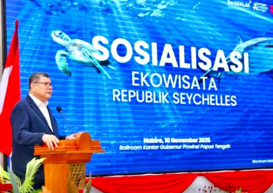 Nabire, admediapapua.com – Duta Besar Republik Seychelles untuk Indonesia, Nico Barito, hadir dalam kegiatan Sosialisasi Ekowisata Republik Seychelles yang berlangsung di Ballroom Kantor Gubernur Papua Tengah, Senin (10/11/2025). Pada kesempatan tersebut, ia memaparkan pengalaman negaranya dalam membangun sektor pariwisata yang bertumpu pada prinsip keberlanjutan.