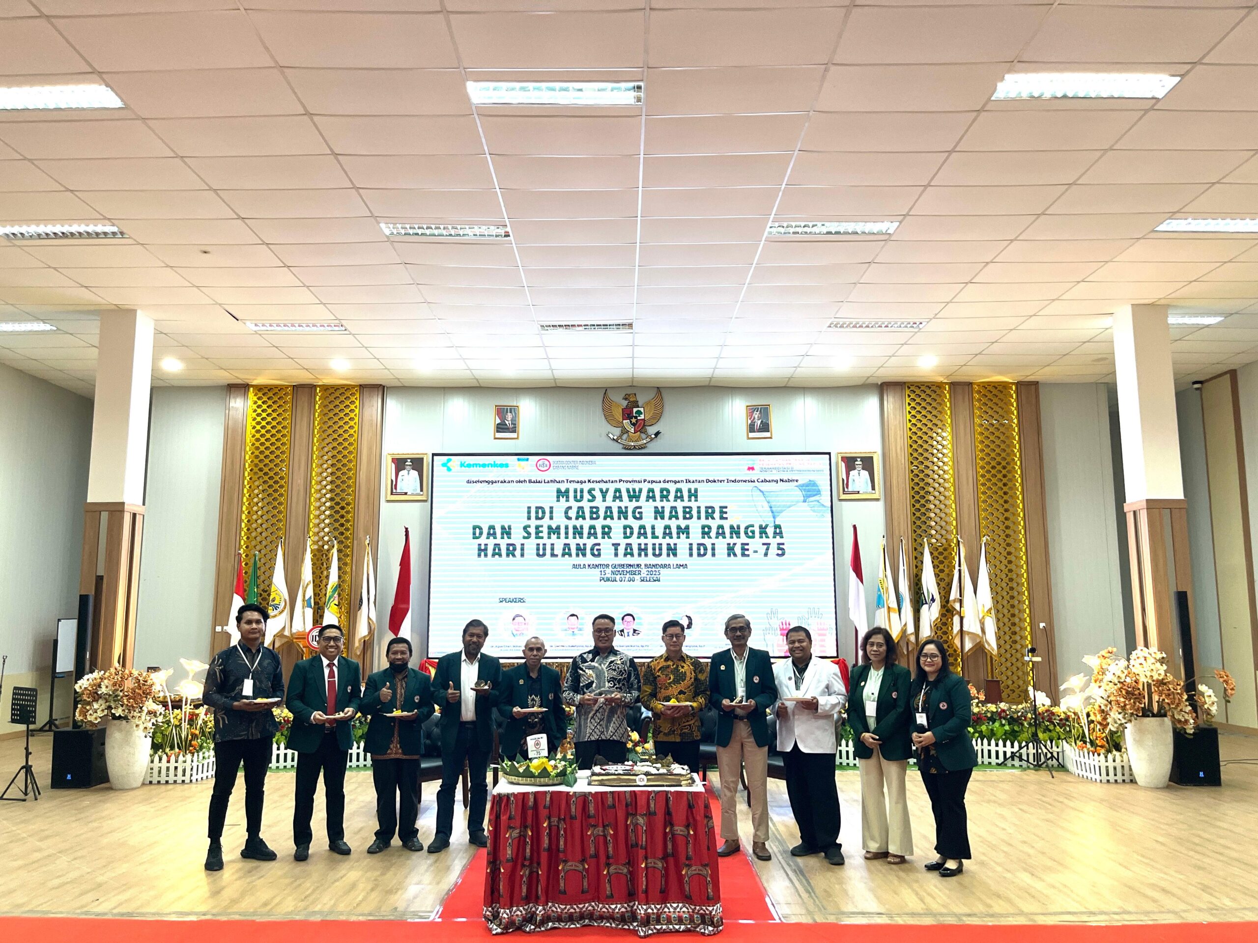 Wakil Bupati Nabire, Burhanuddin Pawennari, dalam sambutannya menyampaikan apresiasi dan ucapan selamat atas HUT ke-75 IDI kepada seluruh keluarga besar IDI Cabang Nabire. Ia juga menegaskan bahwa para dokter merupakan garda terdepan pelayanan kesehatan di Papua Tengah, khususnya di Nabire. “Di tengah berbagai tantangan, mulai dari keterbatasan sarana prasarana, kondisi geografis, hingga dinamika sosial masyarakat, para dokter tetap hadir dan mengabdi dengan profesional, penuh dedikasi, dan tanpa mengenal lelah,” ungkapnya.