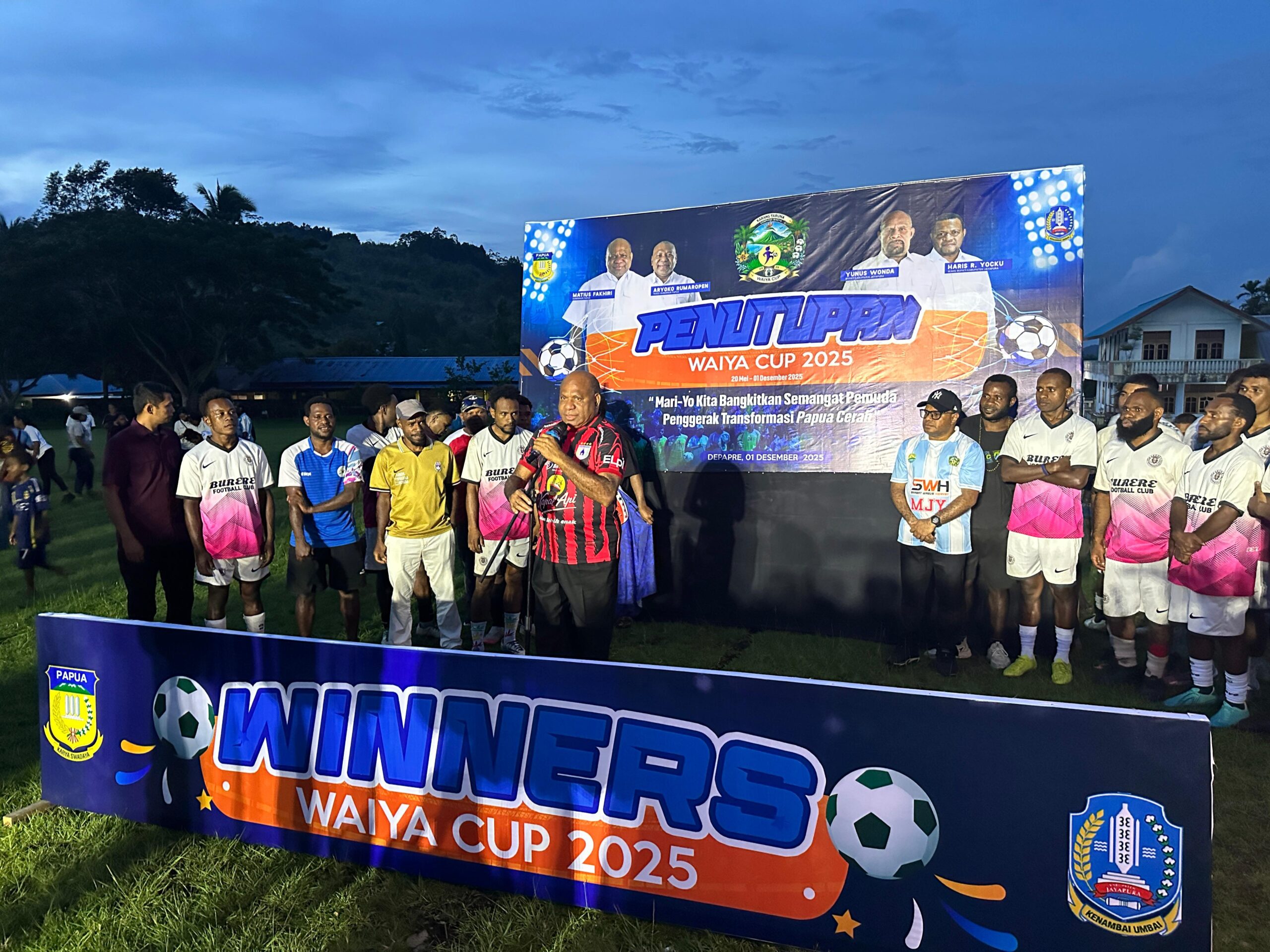 Jayapura, admediapapua.com – Turnamen Waiya Cup 2025 resmi ditutup oleh Gubernur Papua, Komjen Pol (Purn) Matius D. Fakhiri, S.I.K., S.H., M.H., di Kampung Depapre, Kabupaten Jayapura, Senin (01/12/2025). Penutupan tersebut sekaligus menandai berakhirnya rangkaian pertandingan yang telah berlangsung sejak Selasa (20/5/2025).