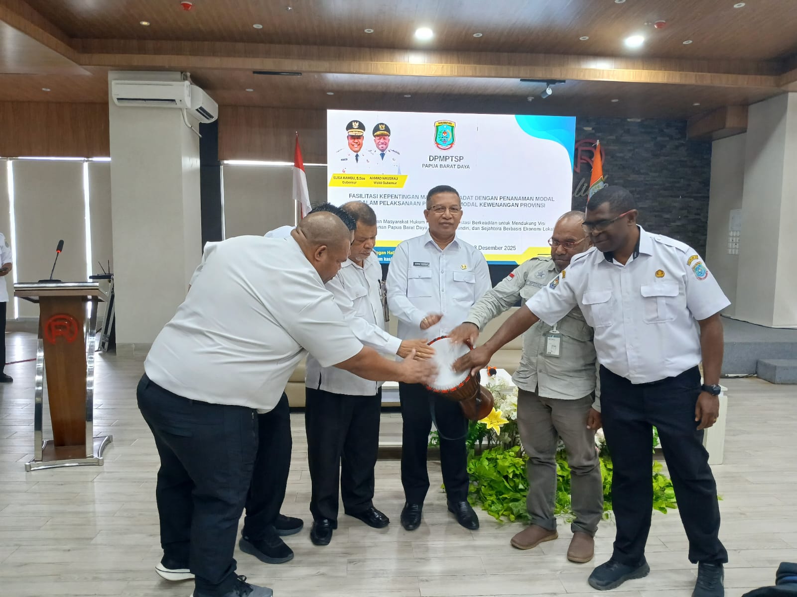Dalam sambutannya, George Yarangga menegaskan komitmen pemerintah dalam memastikan aktivitas penanaman modal di Papua Barat Daya berjalan adil, transparan, dan berpihak pada masyarakat hukum adat.
