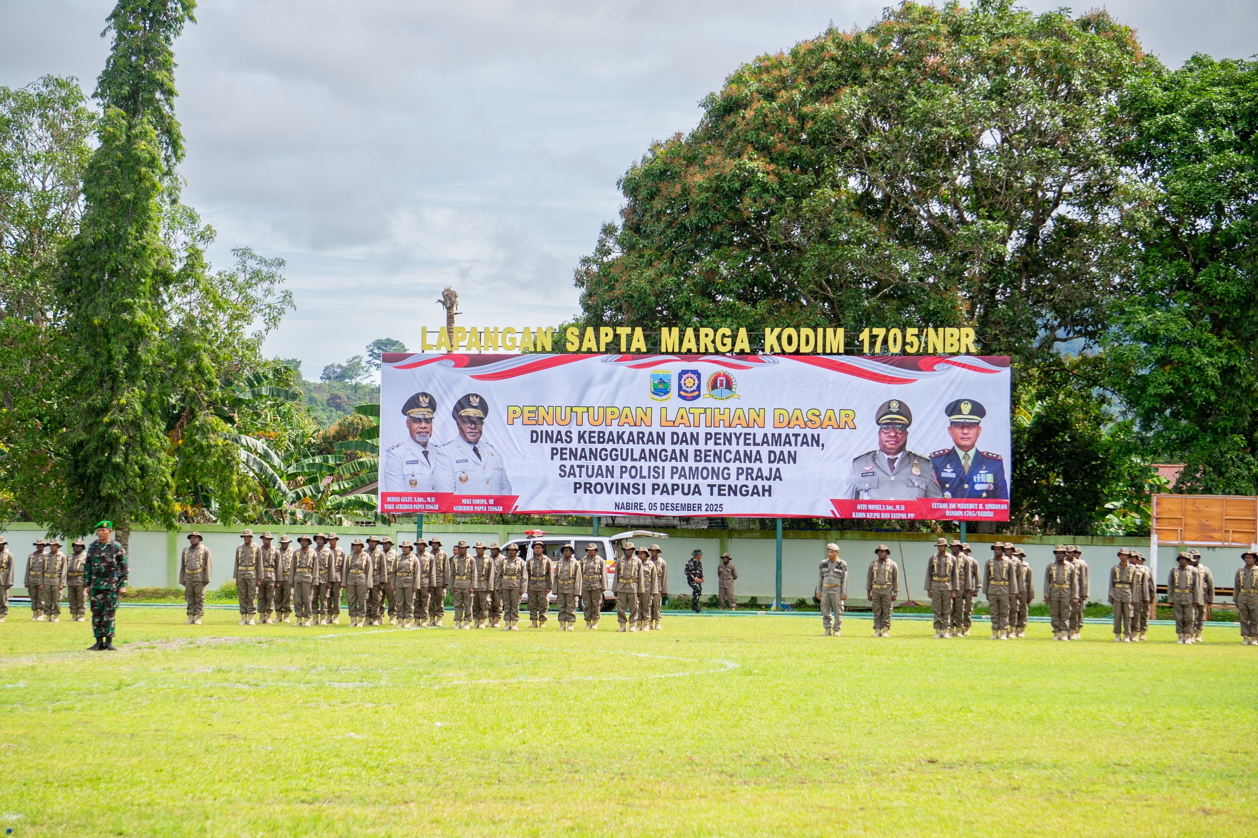 Nabire, admediapapua.com – Latihan Dasar (Latsar) bagi anggota Dinas Kebakaran dan Penyelamatan, Penanggulangan Bencana, serta Satuan Polisi Pamong Praja (Satpol PP) Provinsi Papua Tengah secara resmi ditutup hari ini di Lapangan Sapta Marga Kodim 1705/NBR (5/12/2025).